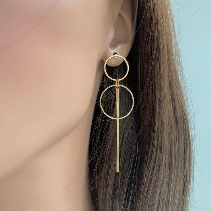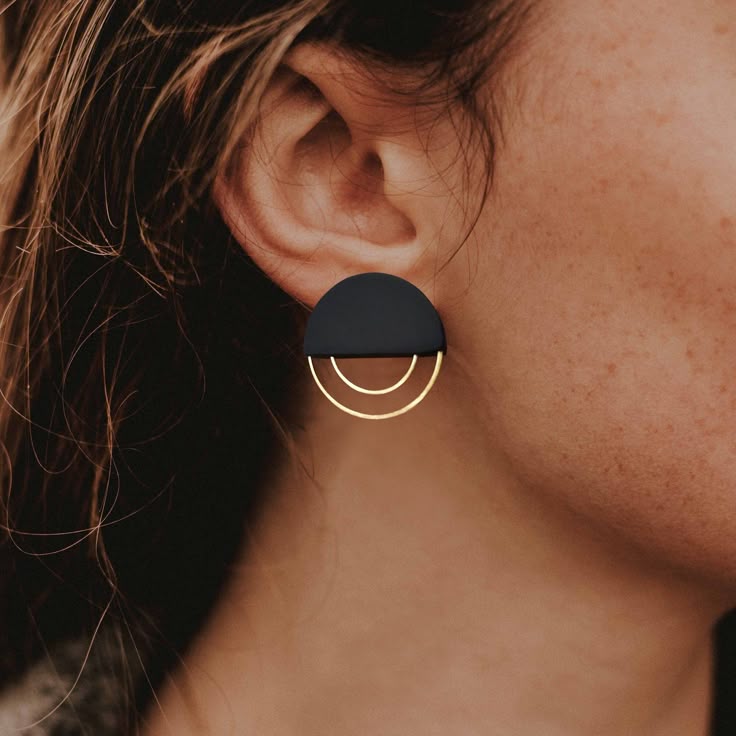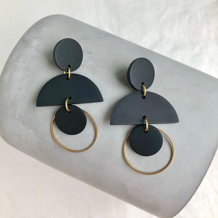 Half Moon and Circle With Brass, Black and Gold Statement Earrings